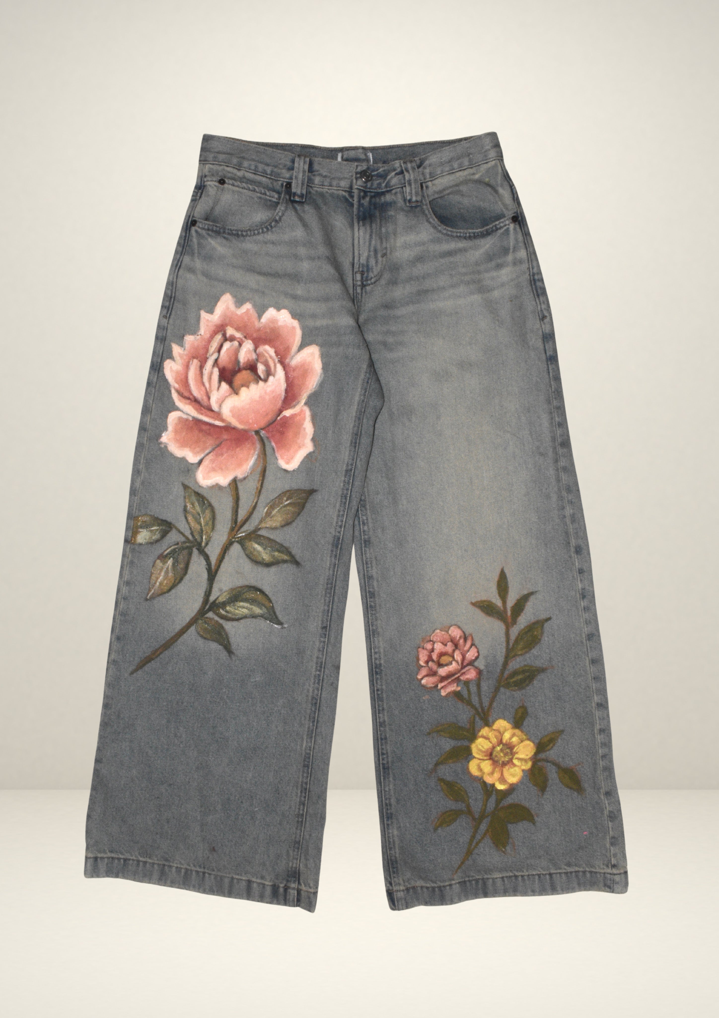I painted this piece because Tiepolo’s Time Discovers Truth is visually striking and beautiful. On denim, the artwork becomes even more captivating, turning the jeans into a moving canvas. My intention was simple: to bring a powerful, beautiful painting into a wearable form
